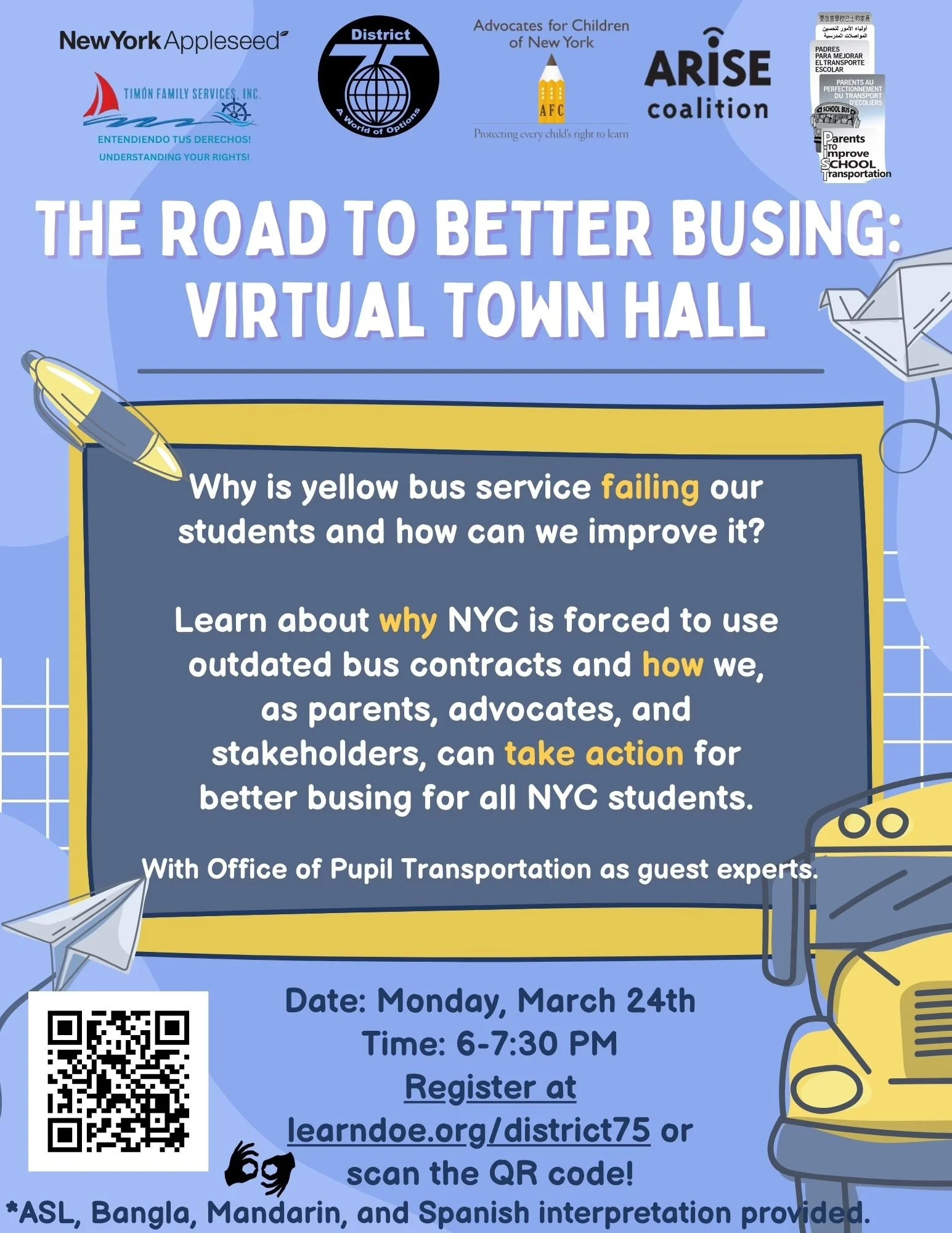 Click on box for image description. Text reads: The road to better busing, virtual town hall. Why is yellow bus service failing our students and how can we improve it? Learn about why NYC is forced to use outdated bus contracts and how we, as parents, advocates, and stakeholders, can take action for better busing for all NYC students. With OPT as guest experts. Date: Monday, March 24th. Time: 6-7:30 PM. Register at learndoe.org/district75 or scan the QR code (bottom left).