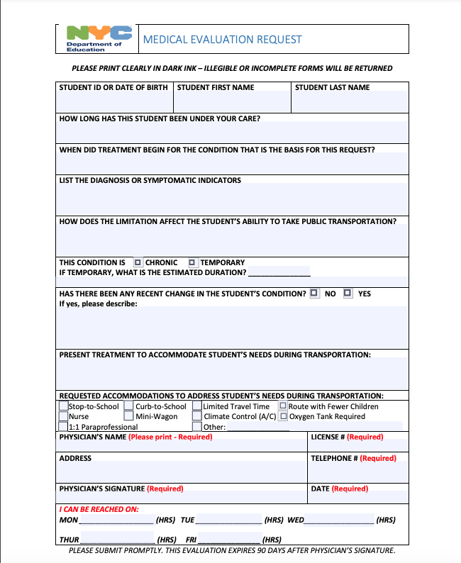 Then the parent/guardian (or foster agency) must have the child's doctor fill out a Medical Evaluation Request, formerly the Request for Medical Transportation Accommodation.